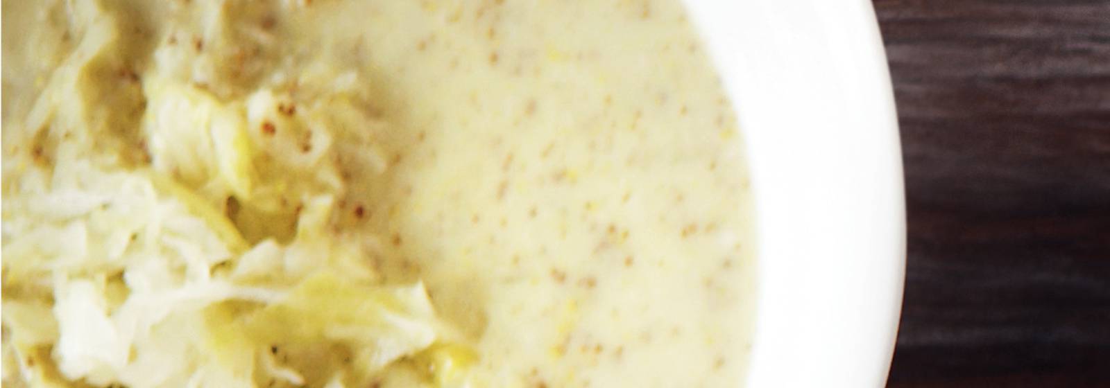 Llevar a ebullición mientras se agita. Sazone con la mostaza y la pimienta y la sal.